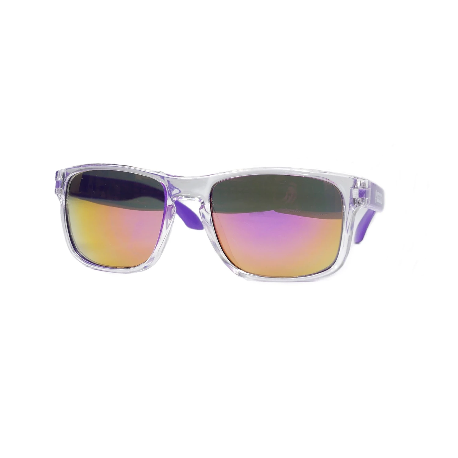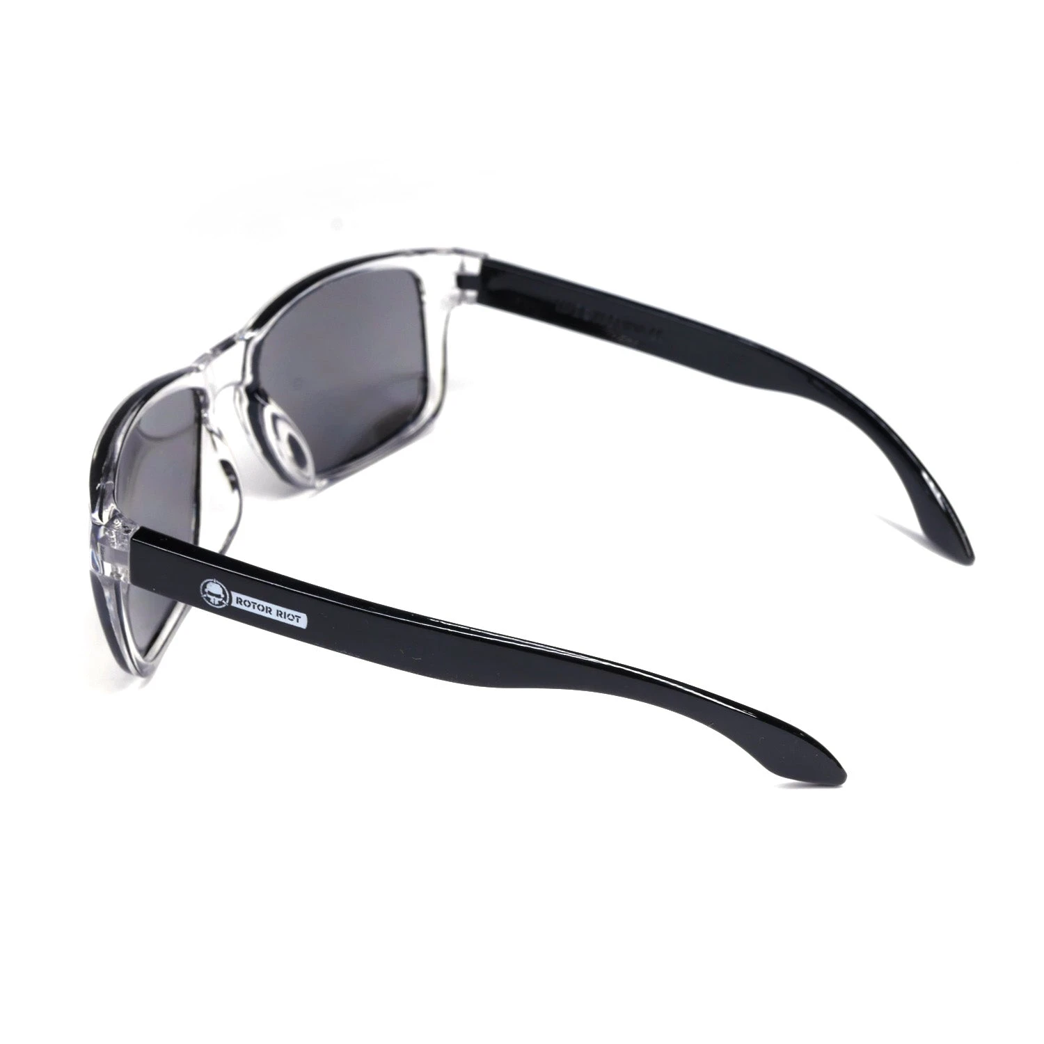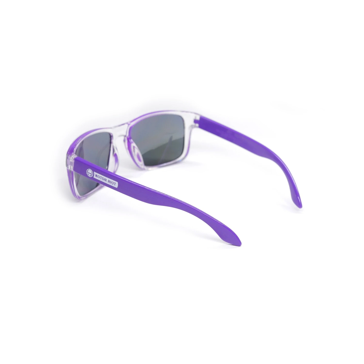 Choose between clear frame with black arms and clear frame with purple arms. Rotor Riot logo.
