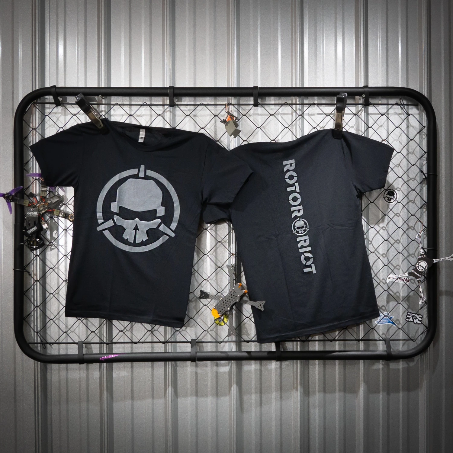 The classic Rotor Riot T shirt with Grey skull logo. Screen printed on soft Next Level shirts.